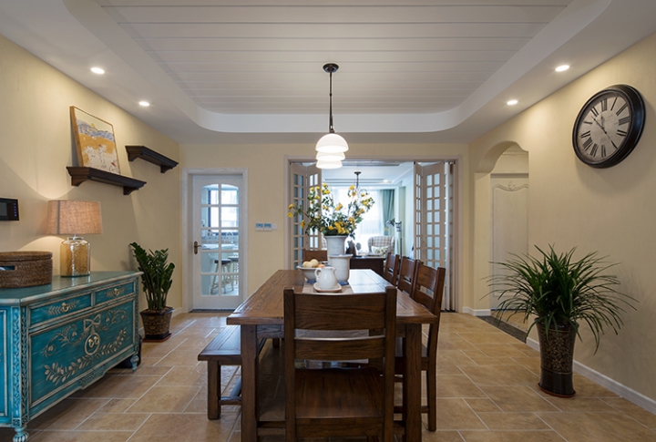 客餐厅在色彩搭配关系上主要采用了同类色色相搭配法,采用温馨的米黄色为主色调,降低了纯度让整个空间非常的和谐,明快,顶面采用了简洁的石膏板吊顶,加上美式风格中典型的木梁设计,朴实而温馨,简约而不简单,间接的暖光源也烘托出温暖的氛围,电视背景采用的是条形的文化石贴饰,体现出一种复古怀旧的美感,沙发背景没选用大面积几何镶板造型,只运用了中间大、两边小的两边实木线条,也符合三段式对称的美学原则,它来源于意大利文艺复兴时期,帕拉迪奥设计师设计的园厅别墅的美学先和,棕色真皮沙发及朴实的实木家具,再加上与业主一同布置的软装,给足了温馨的感觉,简单而随意。运用大自然中最常见的颜色,绿色与黄色相搭配,也与主题相吻合,打造舒适、安静、安逸的的氛围。