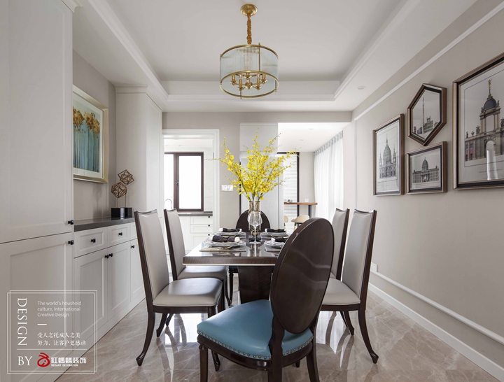 转向餐厅,素简的白色吊顶下,圆形金属现代感的美式吊灯、木色的长方形餐桌形成几何感碰撞,餐桌座椅的米色、蓝色的跳色也运用的十分恰当。一边是定制的成品高低柜子,一边是具有造型的餐厅背景墙,几幅装饰画一点缀,吃饭时也是一种享受。