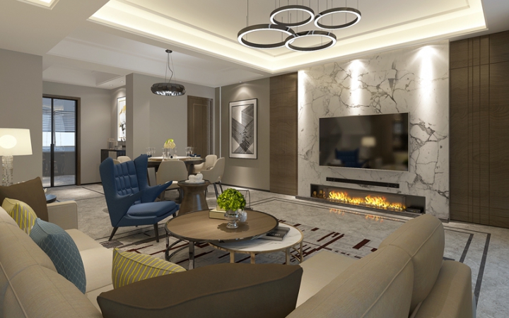 在该空间中,顶面的设计比较简洁,线条简单,没有复杂的石膏线的装饰,但同时我们的顶面灯光设计中,能保证光线的亮度和颜色能完全保证生活和设计上的需要。在墙面的装饰上,设计中采用部分空间留白的理念来营造出风格中的个性。对于每一个重要的空间,我们会突出表现设计的理念,突出整体的时尚感。比如一楼的客厅电视背景墙,我们使用了大理石和木饰面两种材料,将大理石作为主背景,它本身自然的石头纹理起到了装饰的作用,两边的木饰面则中和了石面的冰凉感。将这两种材料结合起来设计成的简约的背景,营造出空间的精致和时尚感。