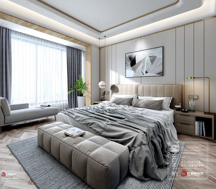 主卧的处理上,作为休息的空间希望可以通过简约的配色和一些圆弧形态的结构,为主人卸去疲惫,提高睡眠质量。